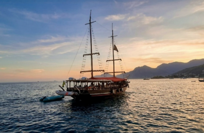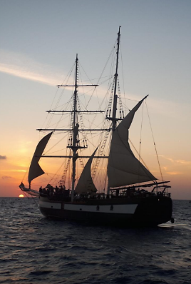Desfrute da praia durante o dia e volte de barco contemplando o maravilhoso pôr do sol no mar.